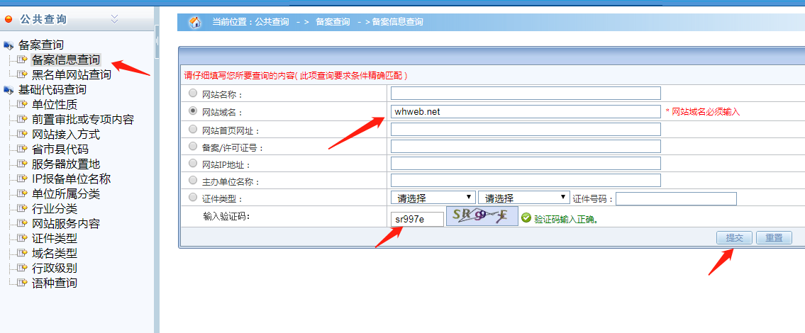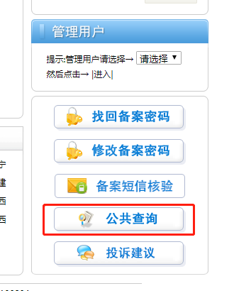 進入公共查詢后選擇備案信息查詢,輸入任意一條信息,在輸入驗證碼,提交便可得到查詢結(jié)果。